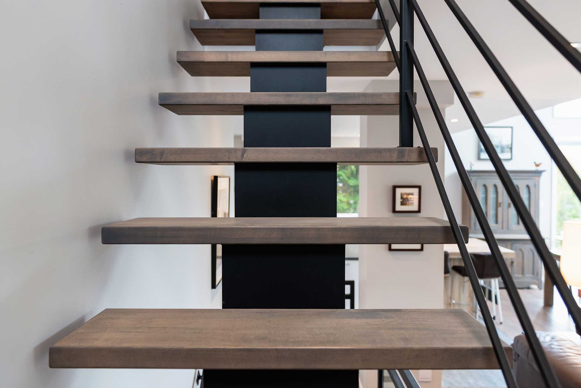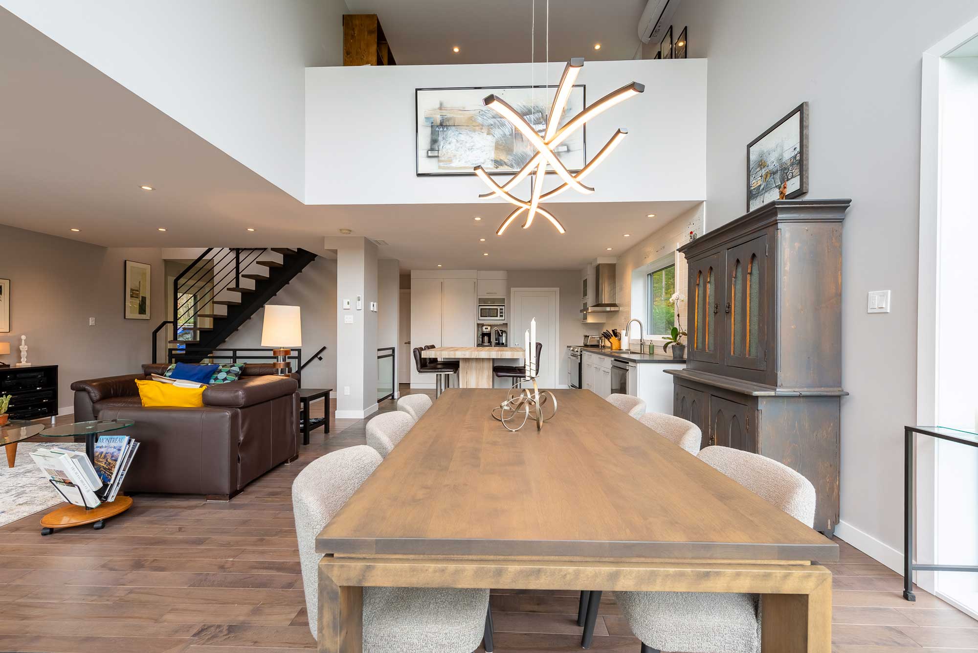 The fireplace suspends time at the center of the space, while the light, sculptural staircase guides steps between floors. The materials, chosen for their simplicity and warmth, interact with the modern lines of the architecture.