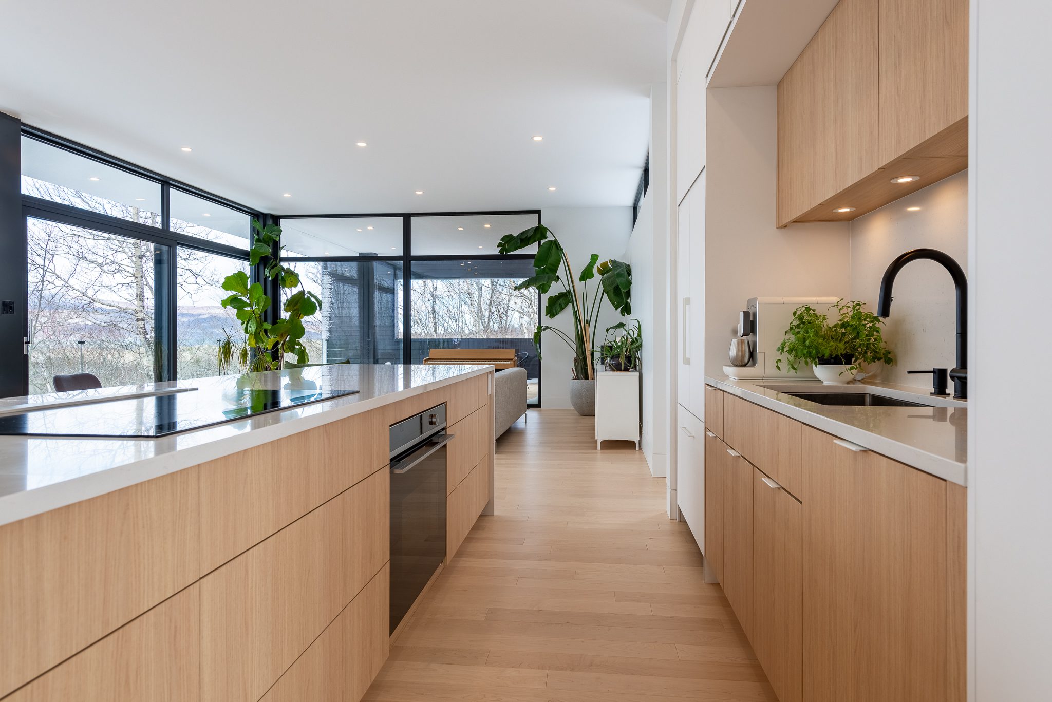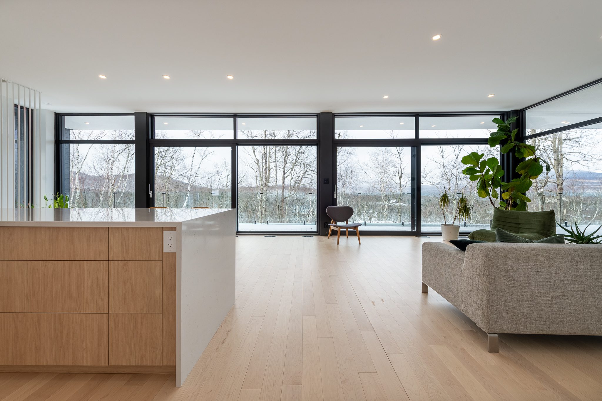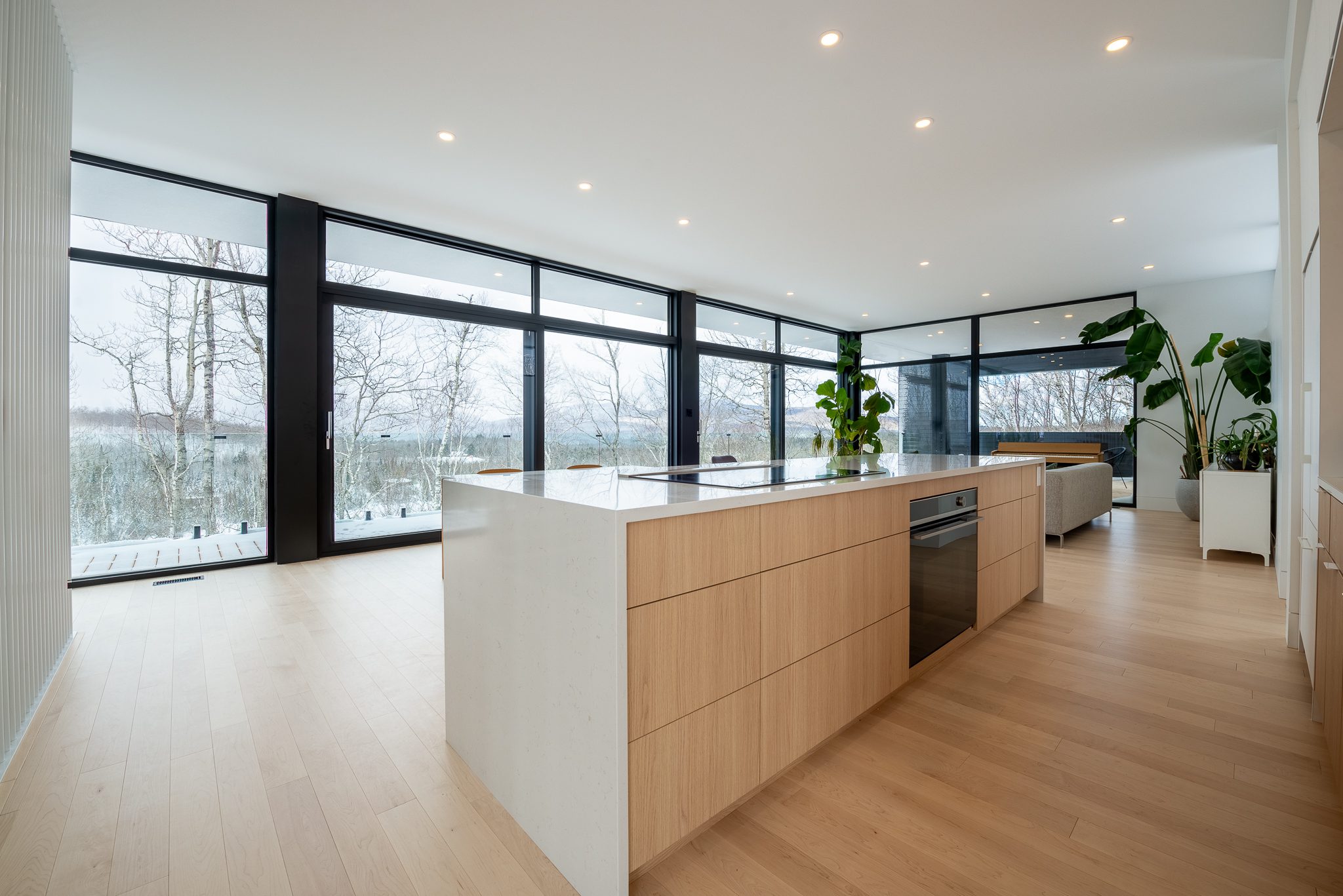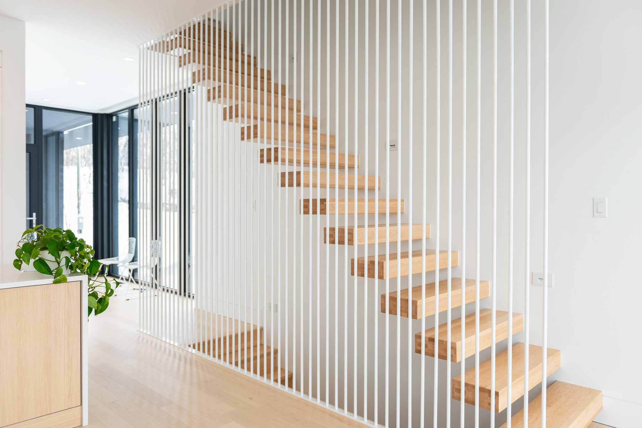 Blond wood floors extend right up to the floating staircase, white walls amplify every reflection, and matte black metal accents anchor the ensemble with strength. The kitchen, with its massive island, clean lines and light tones, becomes the calm heart of the home – a sober, luminous gathering place.