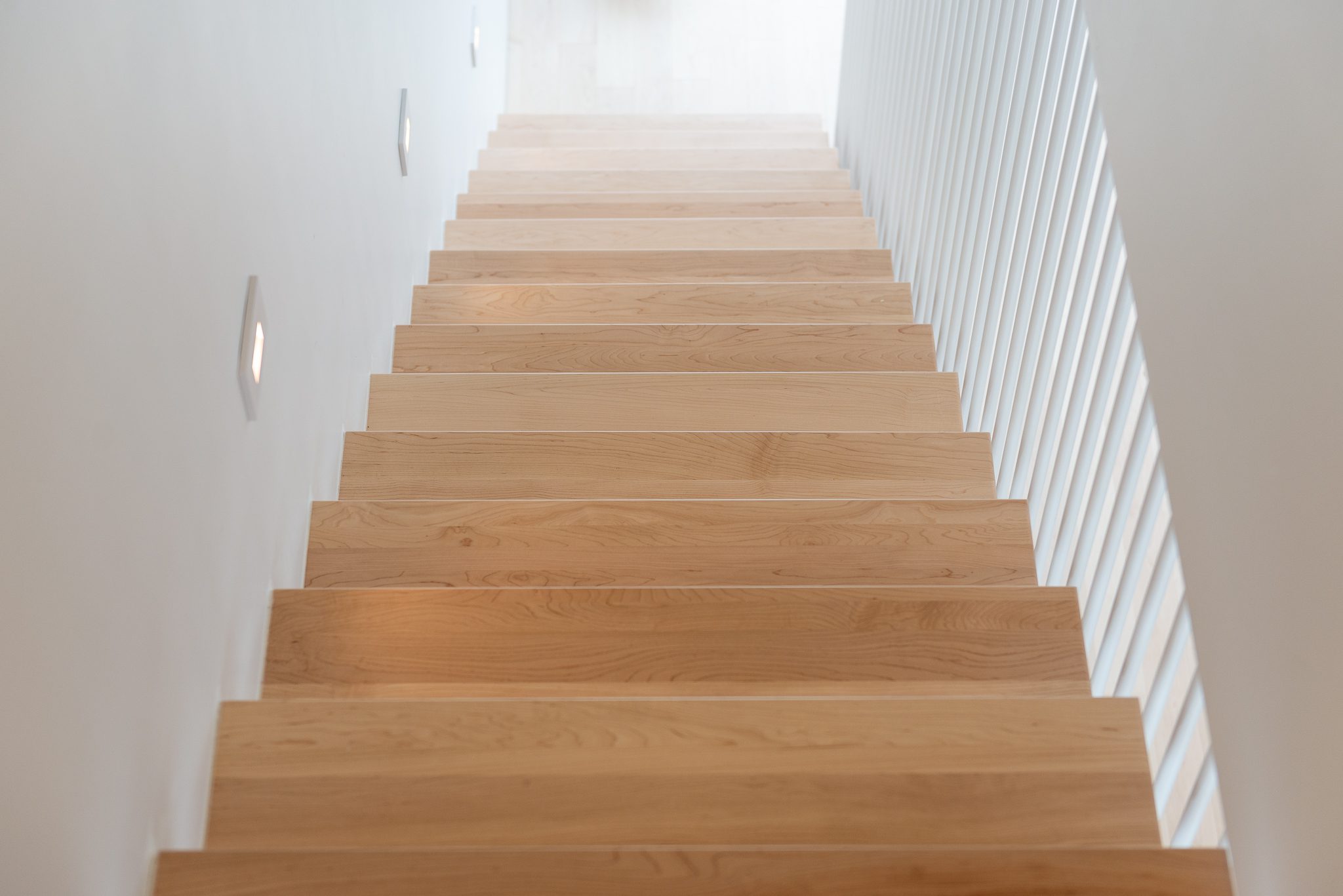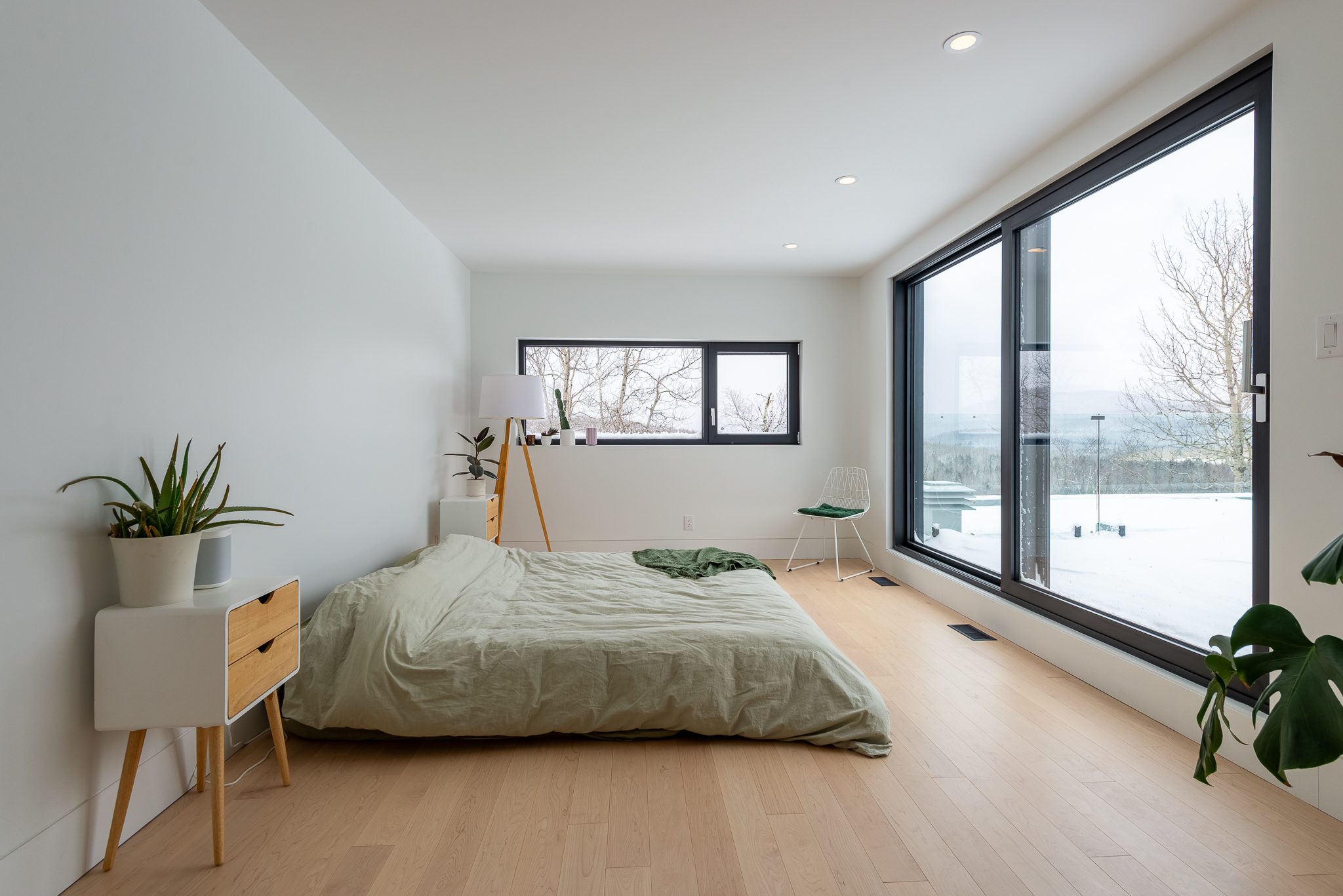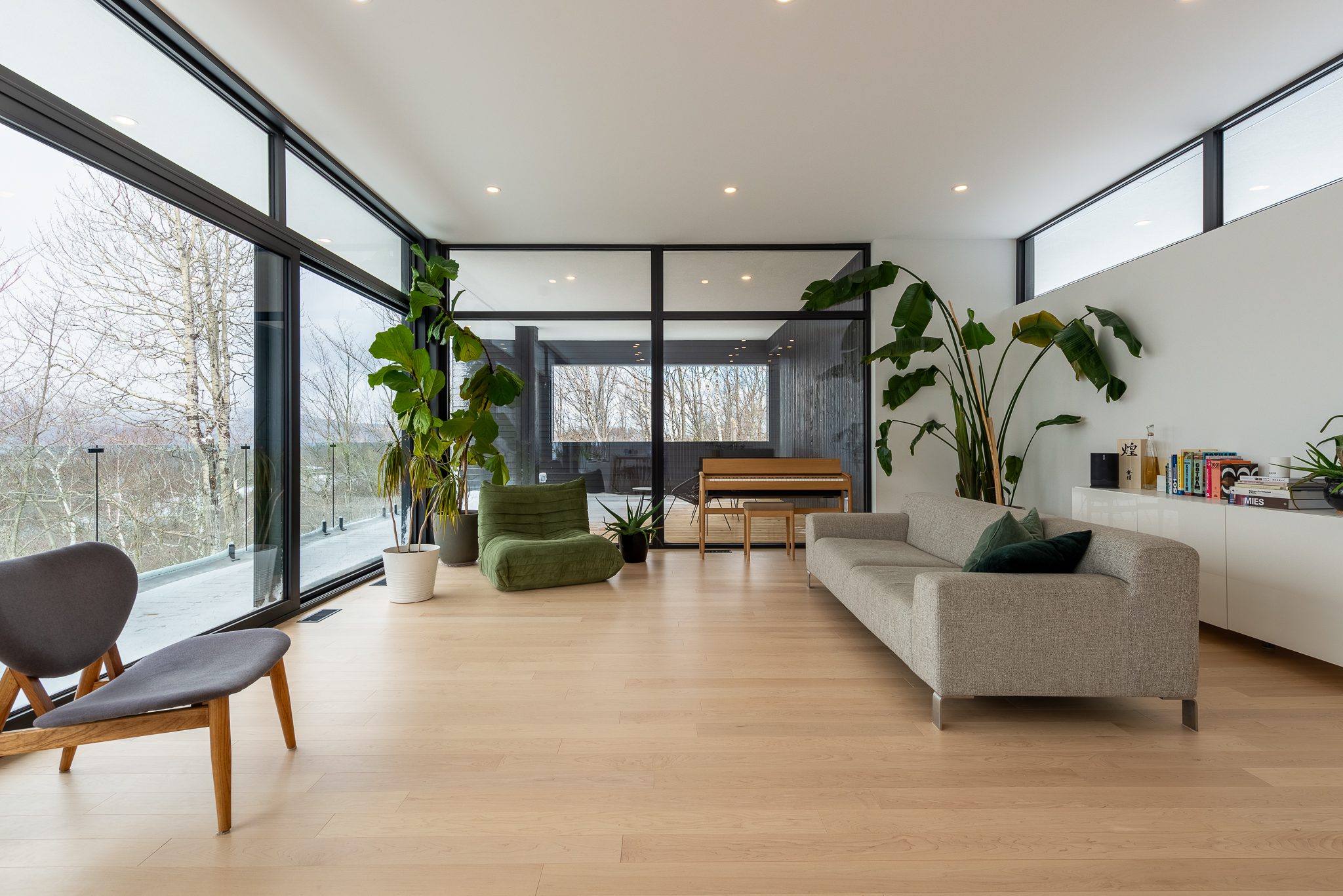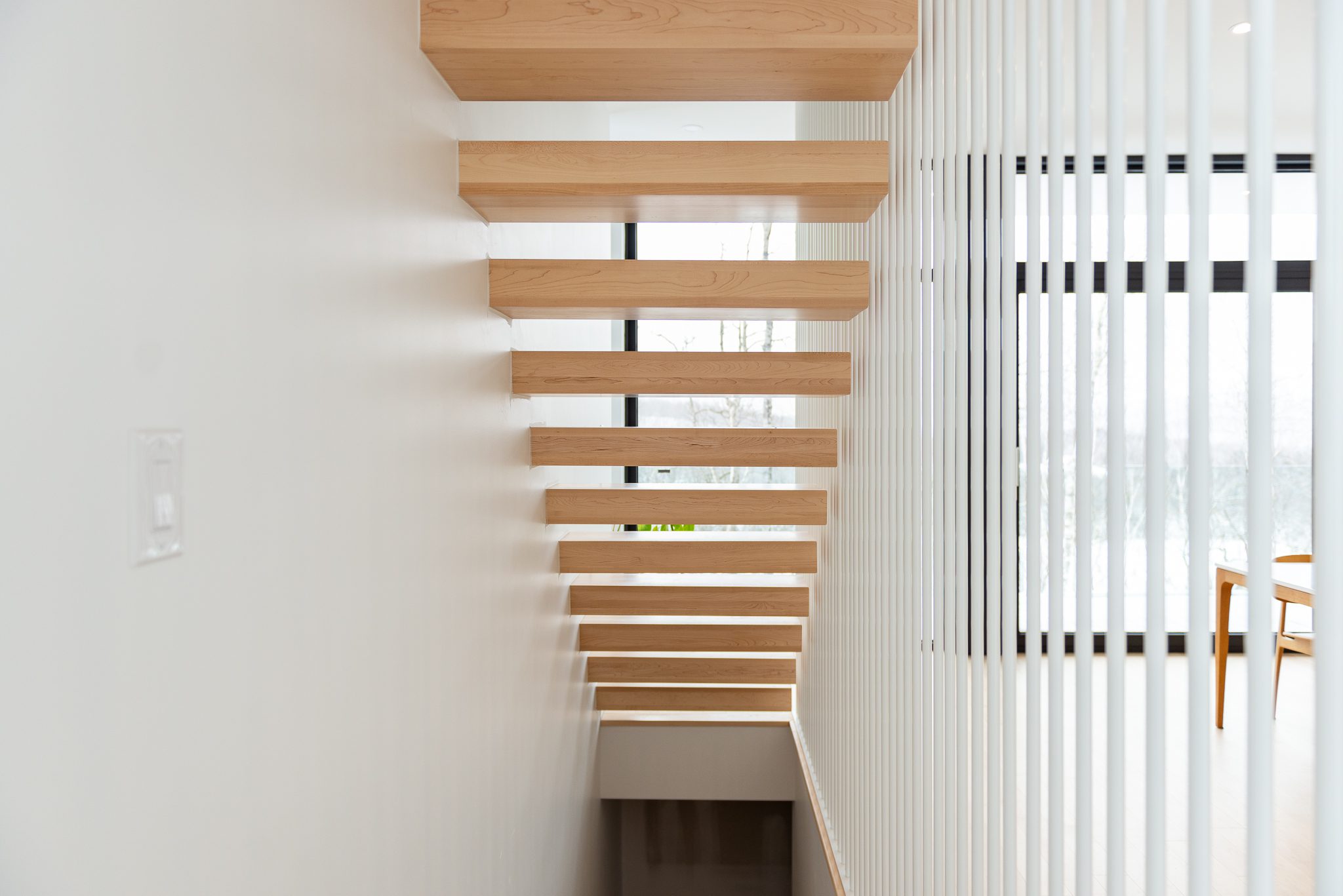 Blond wood floors extend right up to the floating staircase, white walls amplify every reflection, and matte black metal accents anchor the ensemble with strength. The kitchen, with its massive island, clean lines and light tones, becomes the calm heart of the home – a sober, luminous gathering place.
