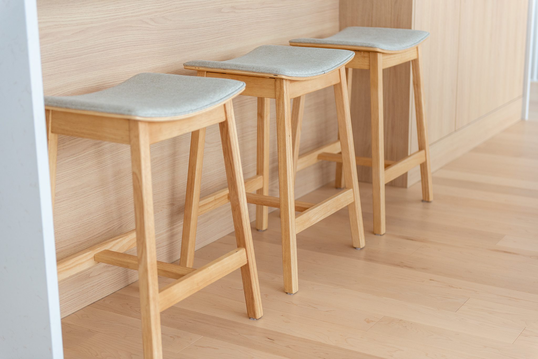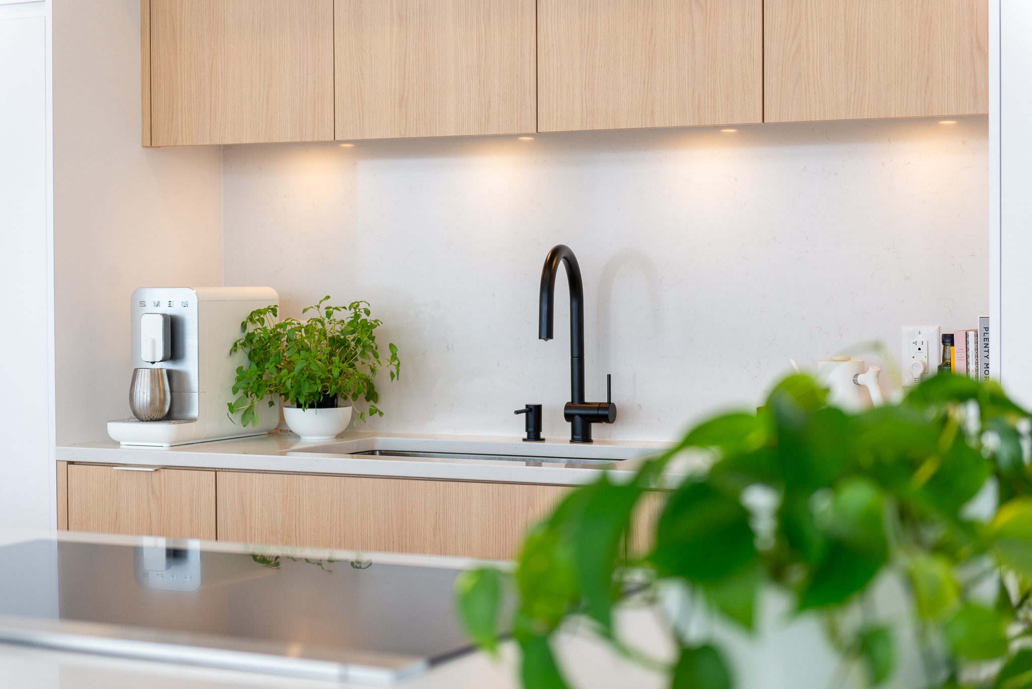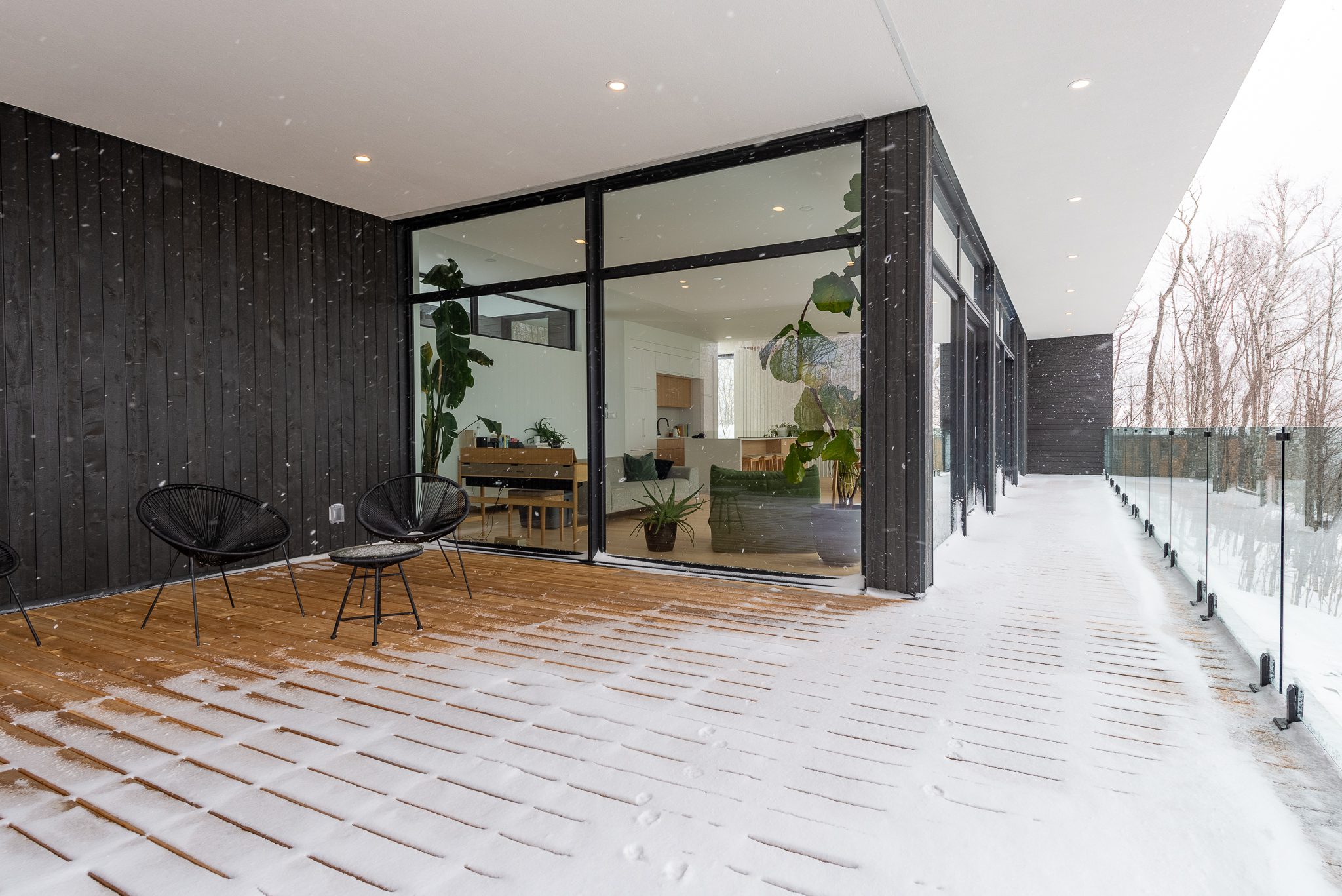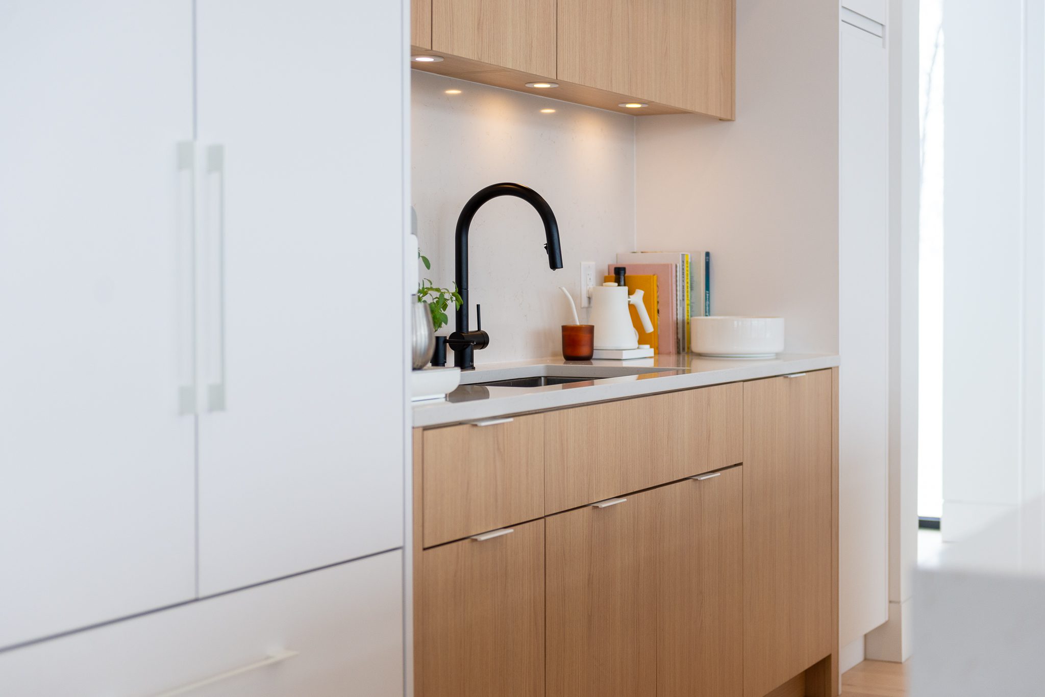 Blond wood floors extend right up to the floating staircase, white walls amplify every reflection, and matte black metal accents anchor the ensemble with strength. The kitchen, with its massive island, clean lines and light tones, becomes the calm heart of the home – a sober, luminous gathering place.