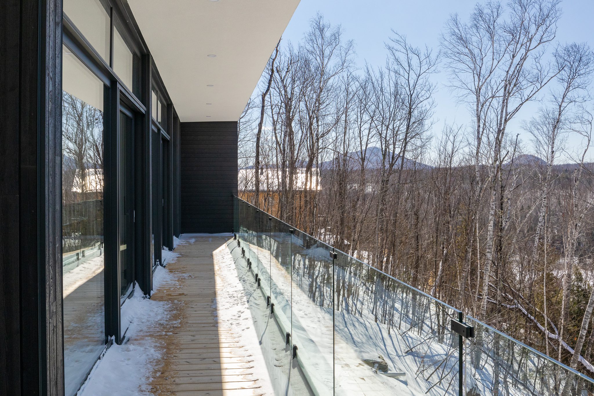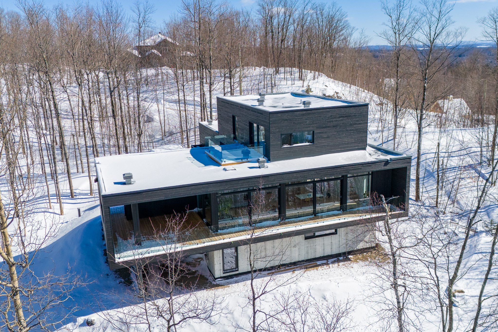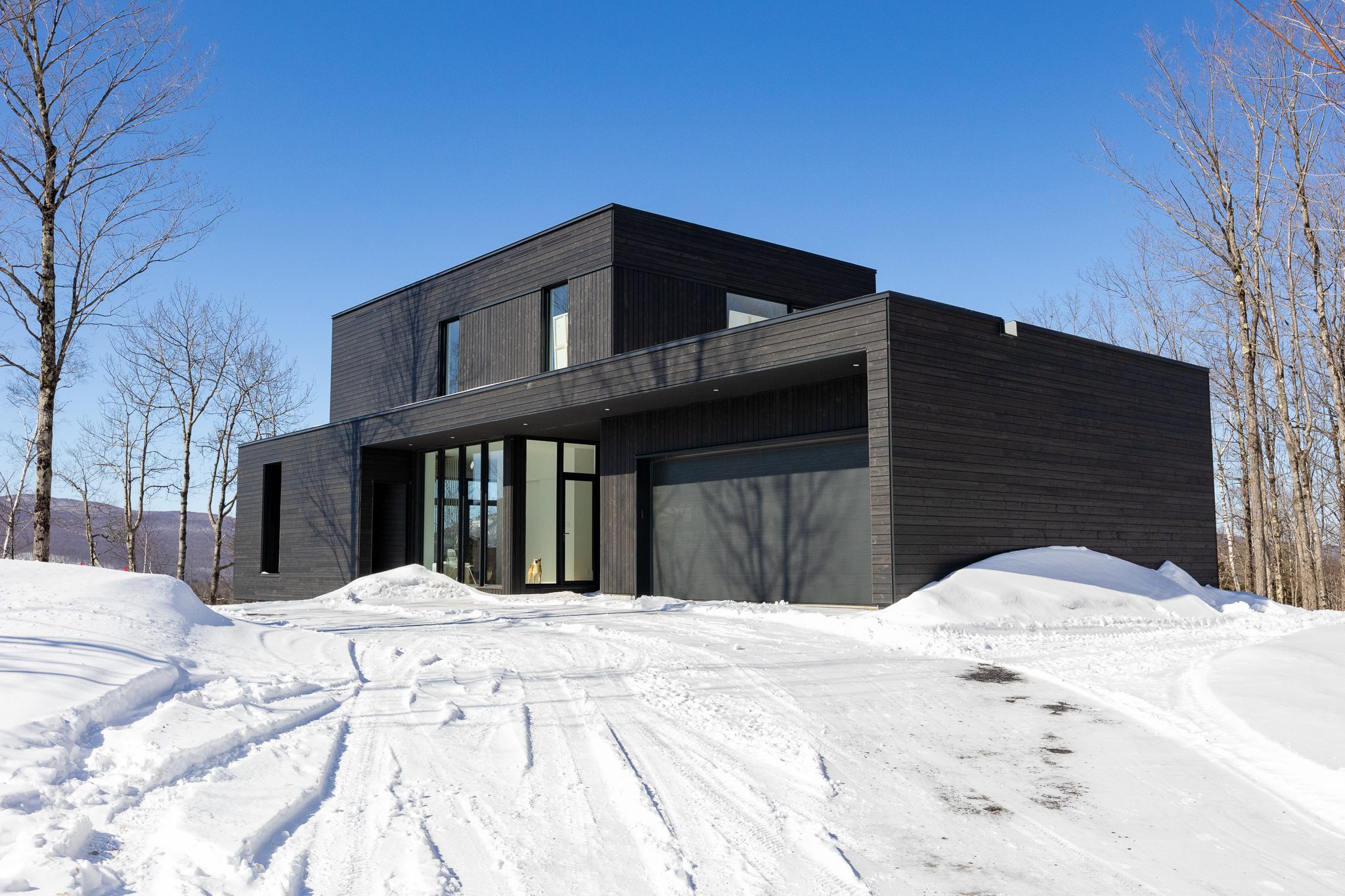 A clean, powerful volume, set atop a wooded plot with mountain views. Inside, light flows freely through open spaces, bathed in natural textures and noble materials.
