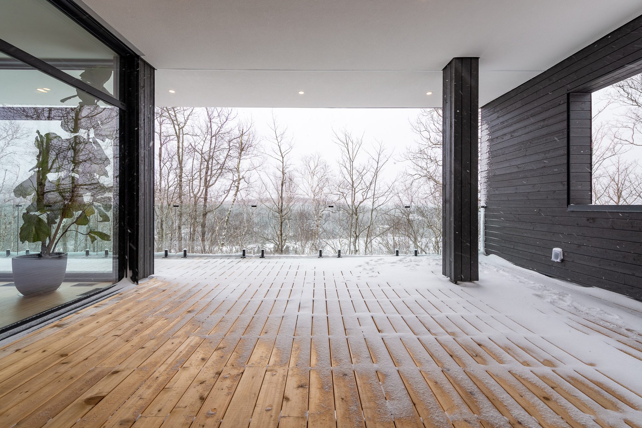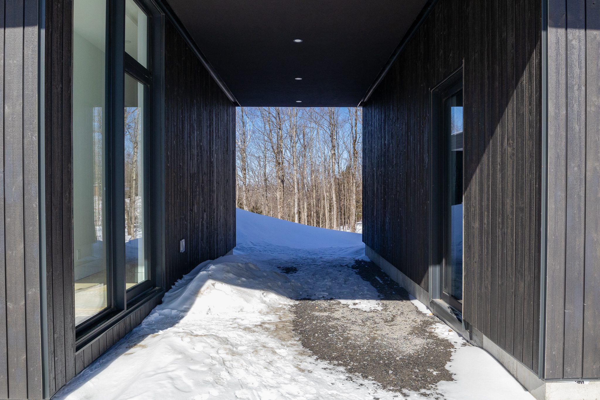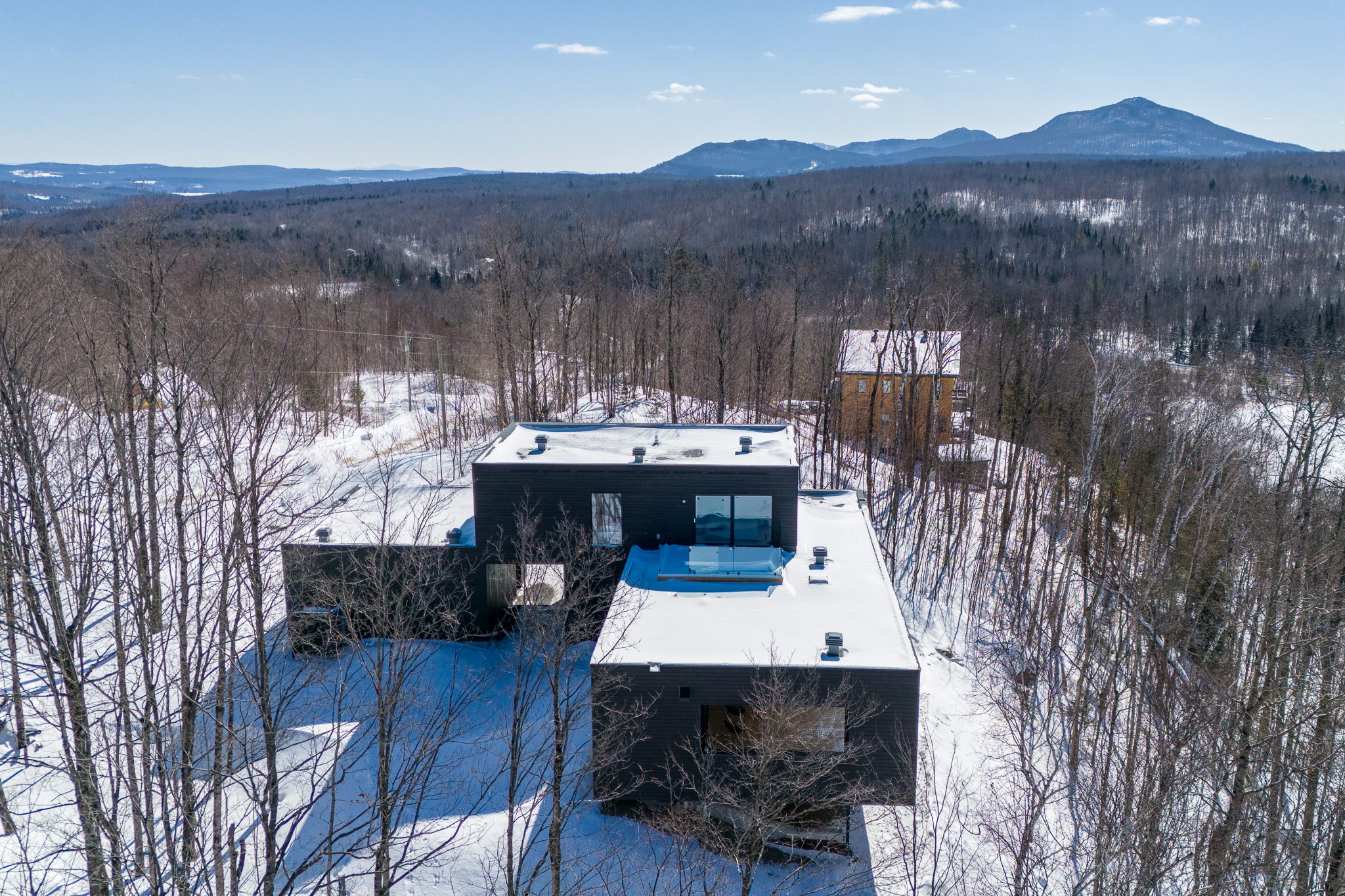 A clean, powerful volume, set atop a wooded plot with mountain views. Inside, light flows freely through open spaces, bathed in natural textures and noble materials.