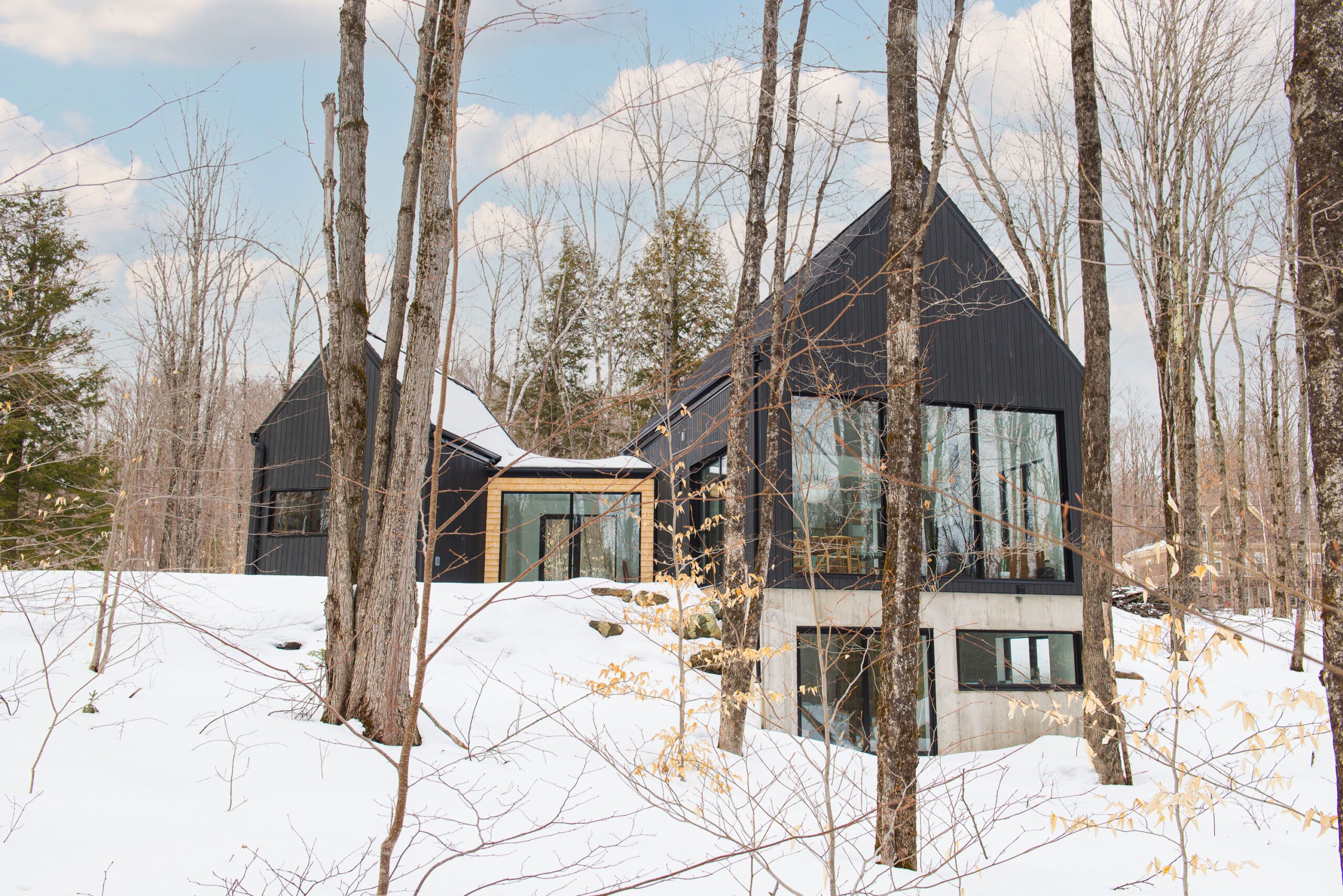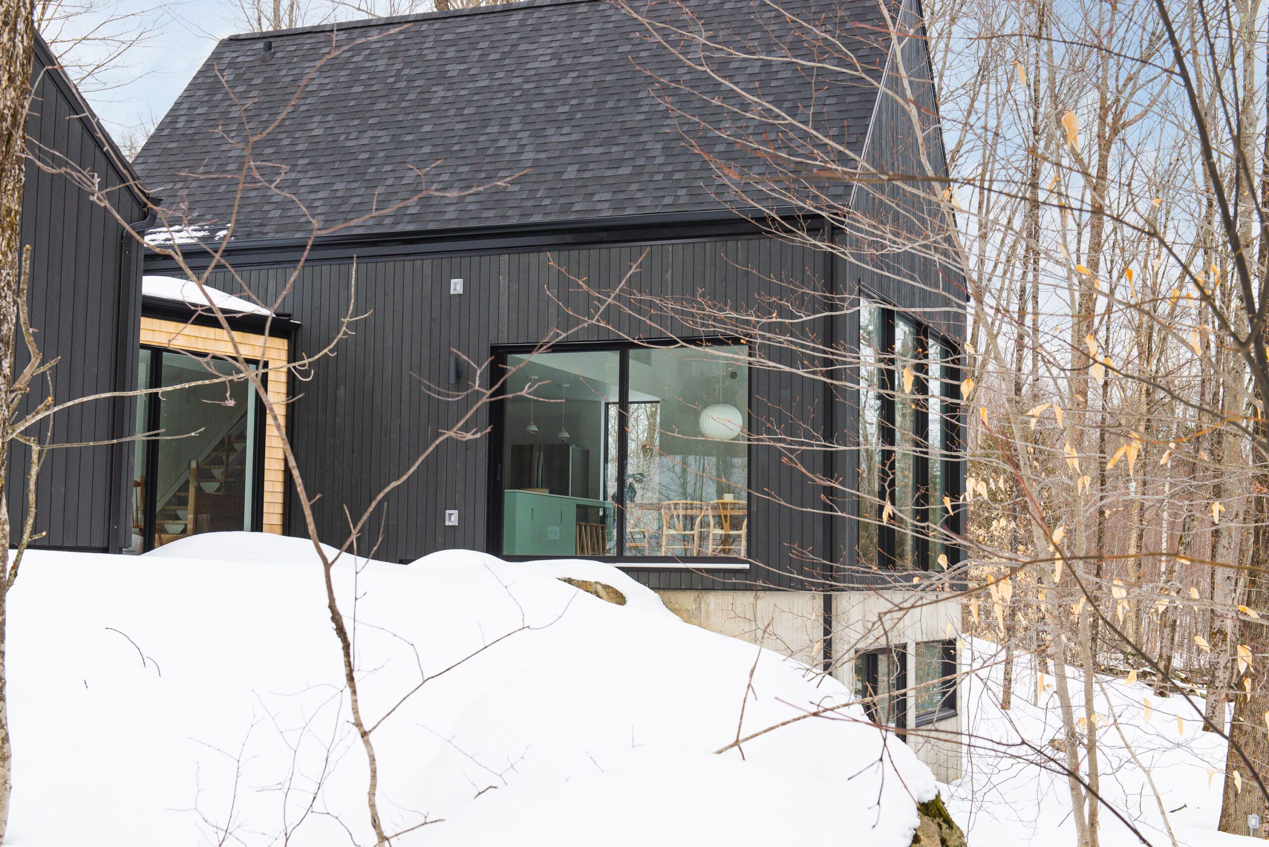 Nichée dans la forêt, la maison de l’écorce prend racine entre deux volumes noirs aux allures de cabanes nordiques, unis par une passerelle vitrée. Son implantation tire parti de la pente naturelle du terrain pour créer une relation directe avec le boisé, peu importe le niveau. Le revêtement sombre en clin vertical contraste avec les inserts de bois clair, évoquant l’écorce et le cœur tendre qu’elle protège.